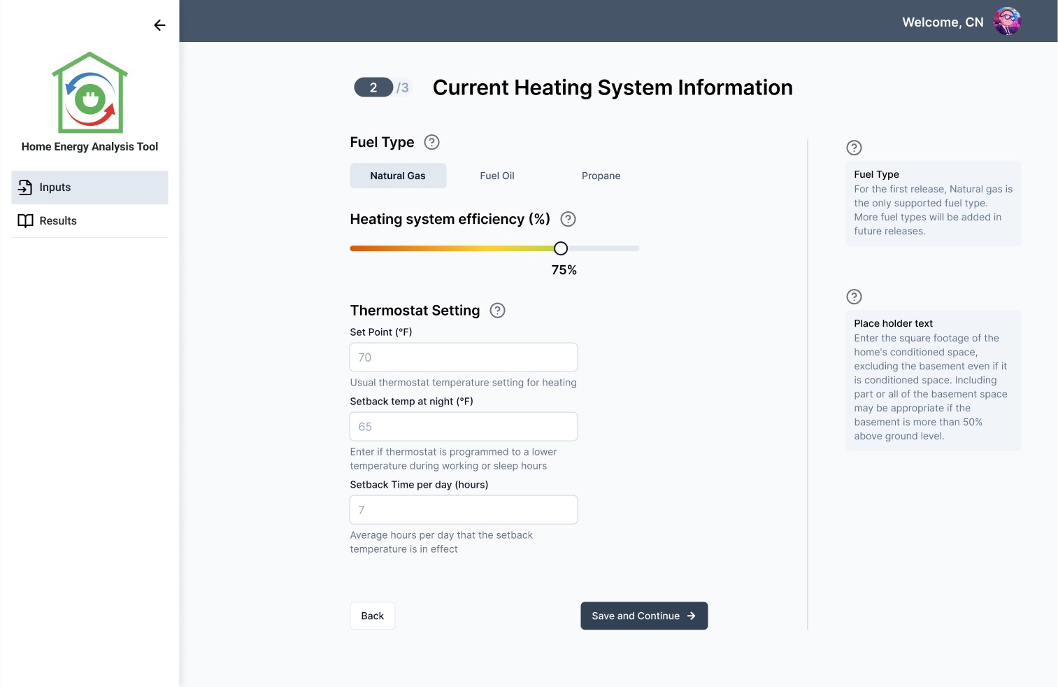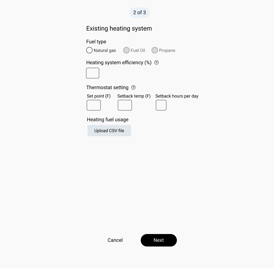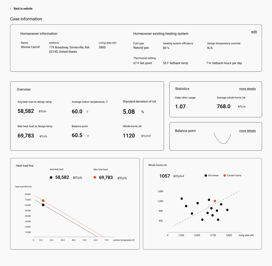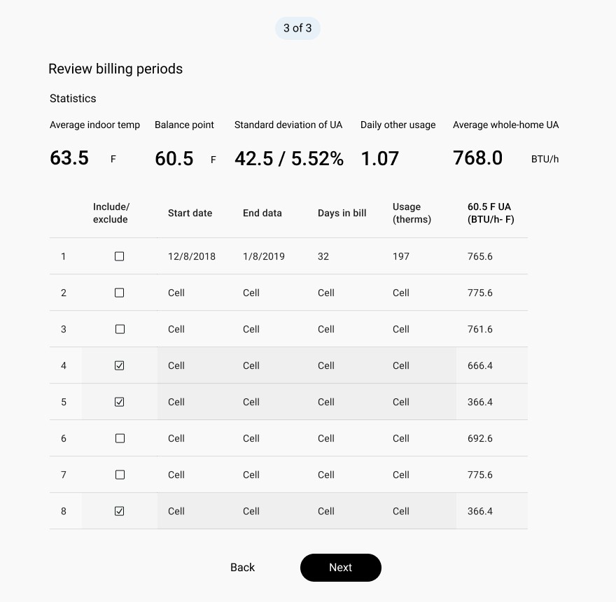 Users will not be able to save a “case” and thus will have to repeat all data entry if they have a reason to repeat the analysis for the same home, such as obtaining additional usage data or new information about the thermostat settings or existing heating system efficiency.