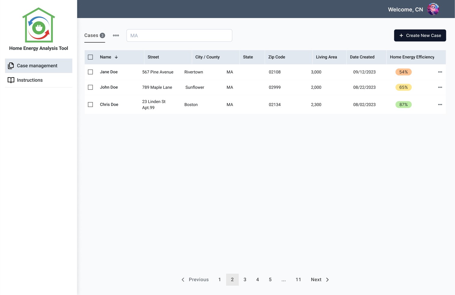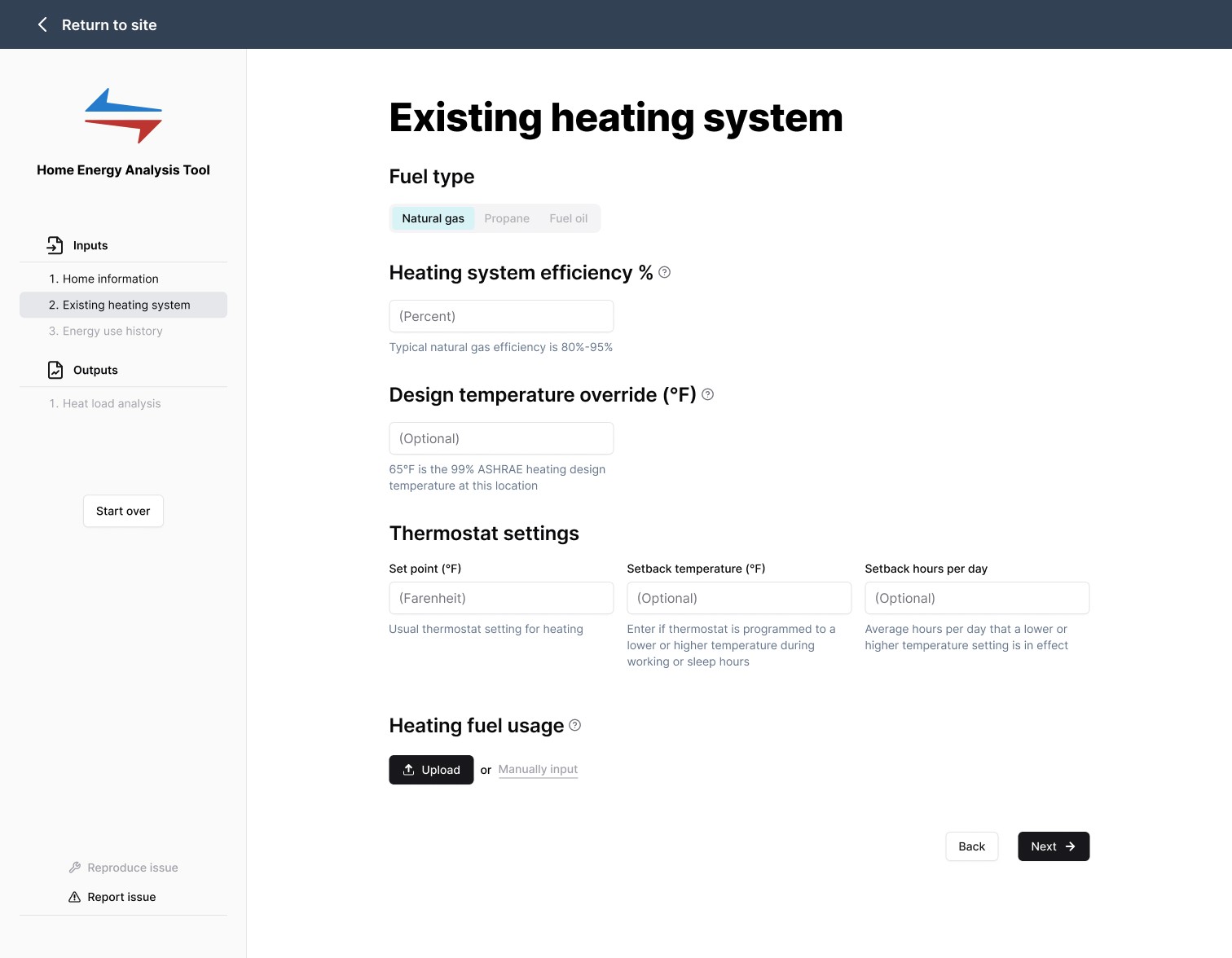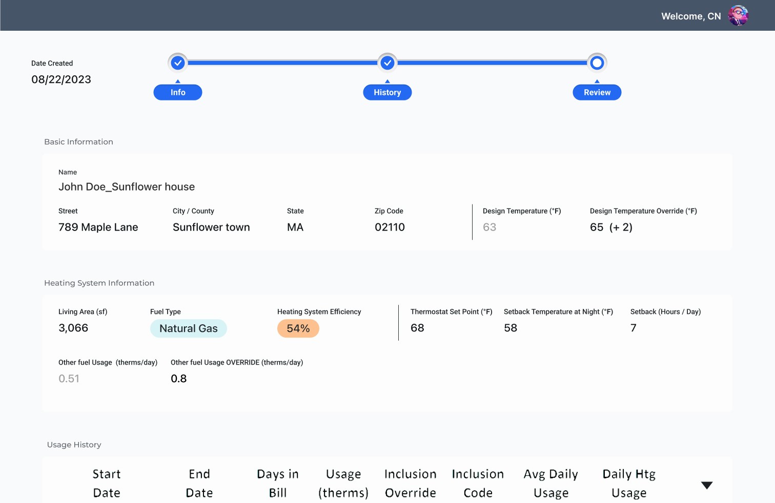 Users will not be able to save a “case” and thus will have to repeat all data entry if they have a reason to repeat the analysis for the same home, such as obtaining additional usage data or new information about the thermostat settings or existing heating system efficiency.