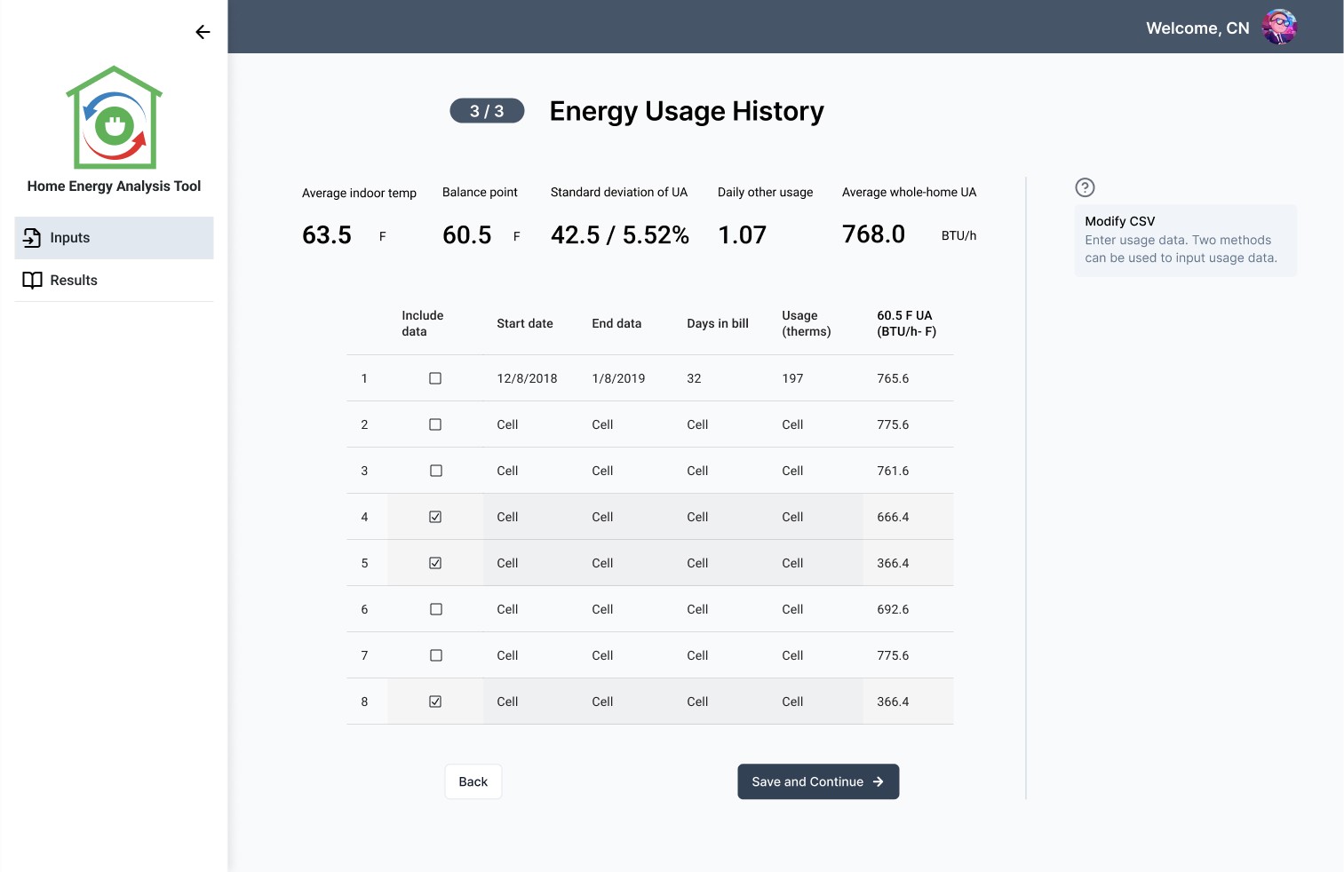 The data table is when user upload their enegergy use history (3 years) as a csv file. By analyzing the usage data during winter, summer, and shoulder months, the tool calculates a set of data for review and assists in generating graphs.